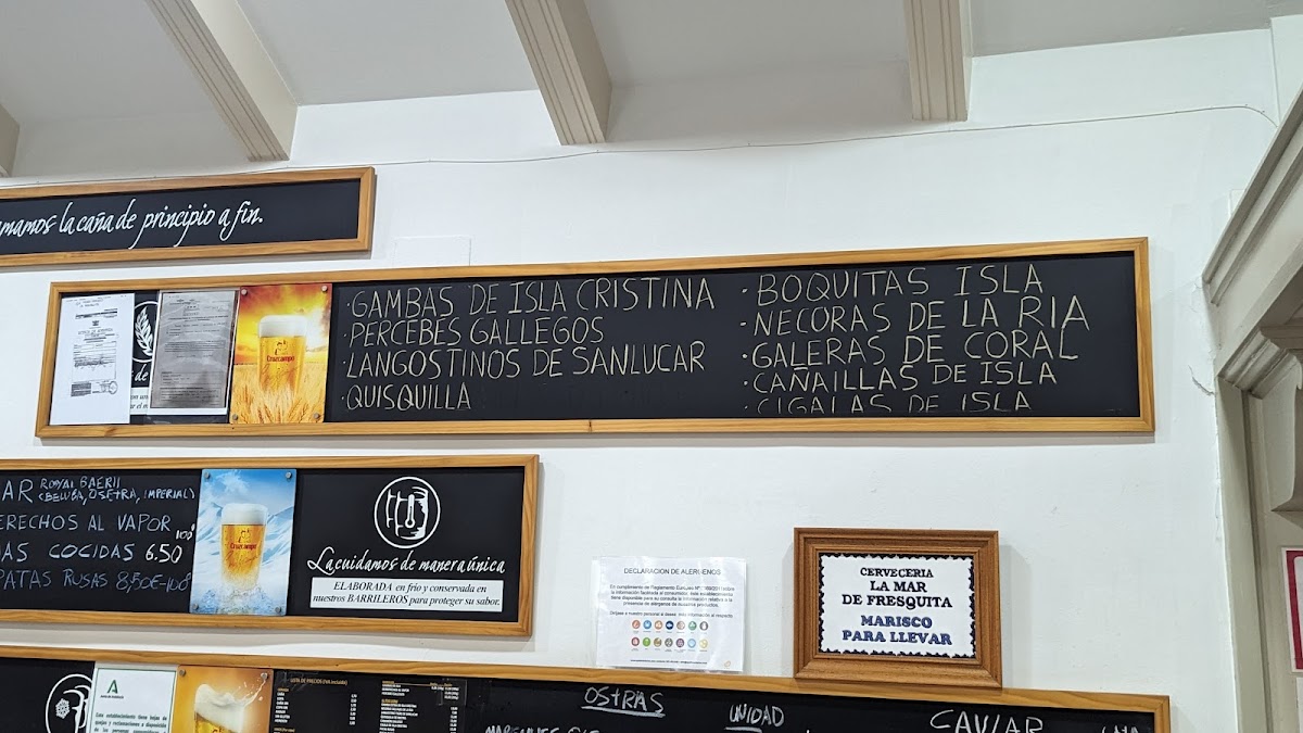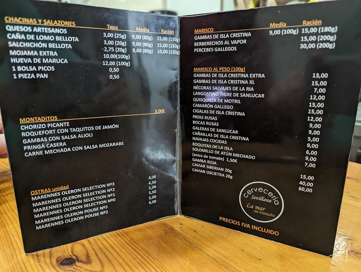 Marisquería La Mar De Fresquita offers a seafood-focused menu that brings the fresh flavors of Spain's coasts straight to your table. The restaurant prides itself on the quality of its ingredients, with standout dishes that highlight the best of the sea. The Gambas Blancas de Huelva Y Ostras deliver a luxurious combination of tender shrimp and oysters, while the Percebes Gallegos offer a unique, savory experience with the prized Galician barnacles. For those looking to indulge, the Caviar Imperial is a decadent option, complementing the Ostras Francesas, which are delicate and briny. Seafood lovers will also appreciate the Berberechos Gallegos, known for their rich, full flavor, and the Bocas Rusas, which provide a satisfying bite of sea delicacies. Moving to the main courses, the Solomillo de Atun Mechado stands out with its perfectly seared tuna steak, offering a rich yet subtle flavor. The Trilogía de Chacinas combines three types of cured meats, presenting a delightful contrast of textures and tastes. Finally, the Collage de Marisco de Temporada brings together a variety of seasonal seafood, making each dish an evolving experience depending on the time of year. This carefully curated selection makes La Mar De Fresquita a must-visit for anyone seeking the freshest and most flavorful seafood in Seville.